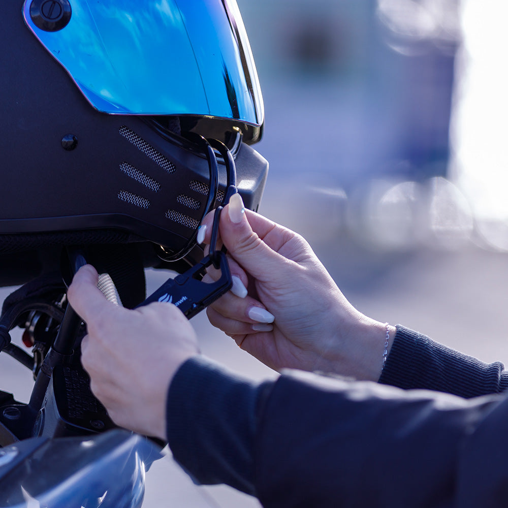 ・従来のヘルメットロックの不便さを解消!駐車時にヘルメットをシートやハンドルバーにかける事も簡単に!